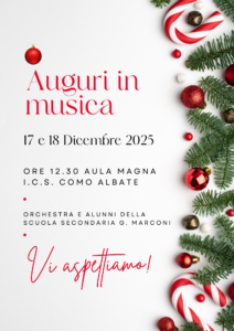 Il 17 e il 18 dicembre 2025, alle ore 12.30, presso l’Aula Magna dell’I.C.S. Como Albate, l’Orchestra e gli alunni della scuola secondaria G. Marconi vi invitano a condividere un momento di musica per gli auguri di fine anno. Vi aspettiamo!